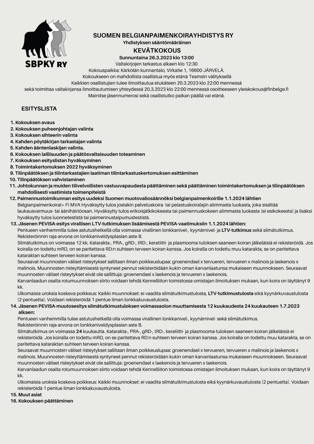 Yhdistyksen sääntömääräinen kevätkokous pidetään sunnuntaina 26.3.2023 klo 13:00 alkaen. Valtakirjojen tarkistus klo 12:30 alkaen
