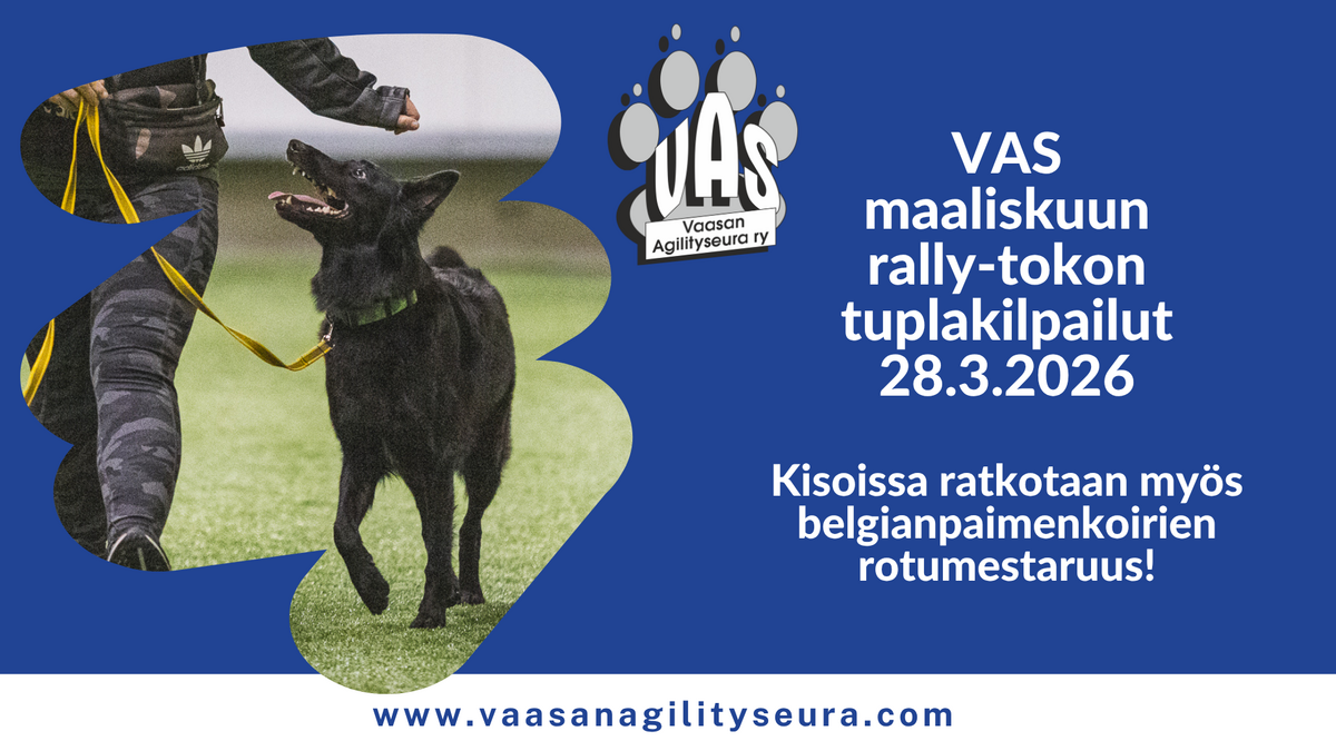 Vaasan Agilityseura järjestää rally-tokon tuplakilpailut lauantaina 28.3.2026. Kilpailussa ratkotaan myös belgianpaimenkoirien rotumestaruus B-kisassa. Luvassa on hyvän mielen rally-tokoa Conexx Areenalla osoitteessa Kiilapuistonkuja 4 (Kappelinmäentien ja Välitien risteys). Tapahtumassa on buffetti. Tervetuloa!