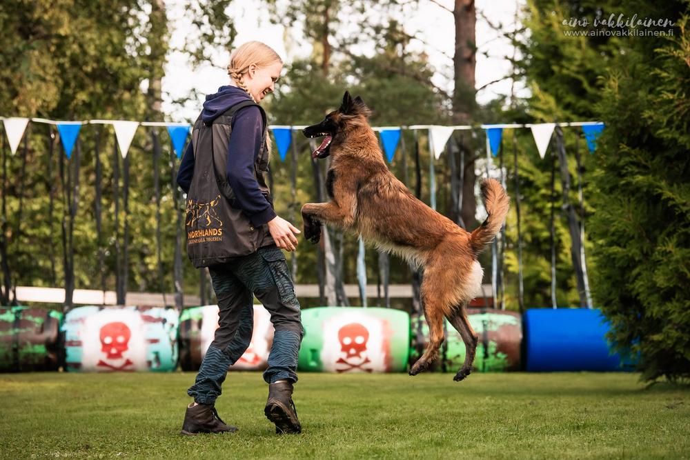 ”Moikka! Mä oon Aino ja mun kisakaverina toimii Myrtti-malinois, virallisemmin Oikukas Calista. Myrtti on minun ensimmäinen tokokoira, jonka kanssa on päästy voittajaan asti, ja on tosi siistiä päästä osallistumaan näin isoon tapahtumaan.